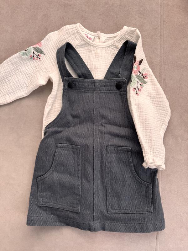 Стильный лук для малышей боди с вышитым рукавом 9-12 мес и сарафан джинсовый 86 размер