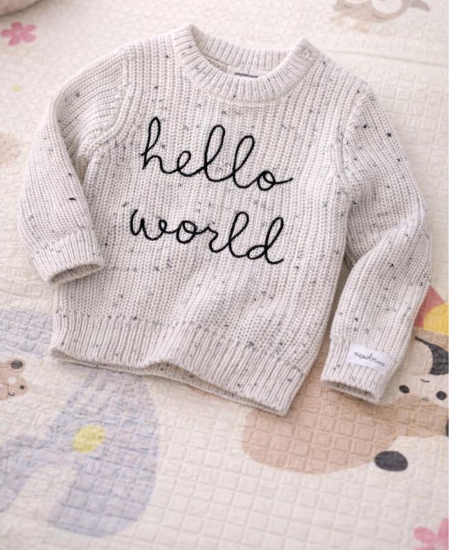 Вʼязана кофточка для немовляти “Hello World” Неймовірно мила та затишна вʼязана кофтинка для найменших. Виконана з м’якої, приємної до тіла ніжного молочного кольору з дрібним вкрапленням Кофточка комфортна, добре тягнеться, Розмір: 56 (0–2 місяці)