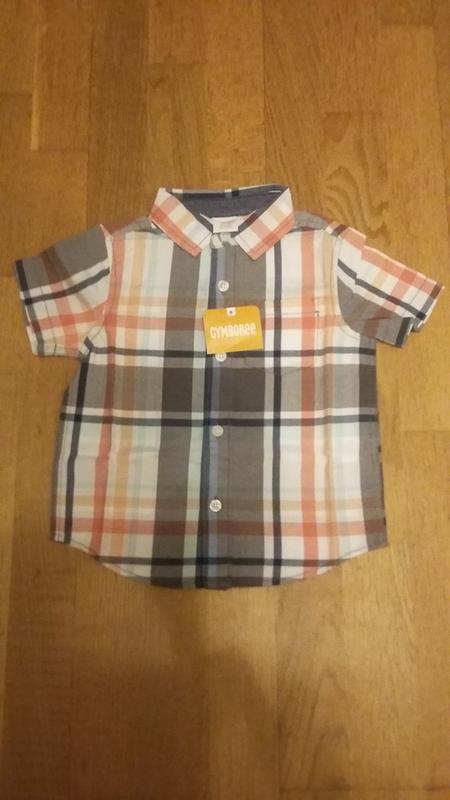 Рубашка для мальчика Gymboree с коротким рукавом. Размер 18-24 М, рост 78-84, 12-13.5 кг Замеры: длина по спинке от плеча- 34 см, от горловины- 37 см, ширина под мышками- 32 см, ширина в плечах- 26 см, длина рукава - 13 см.