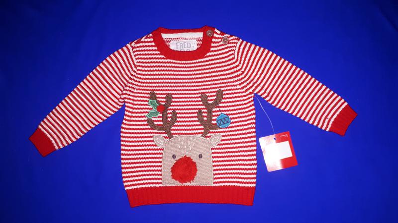 Очень красивый тепленький новогодний свитерок для малыша на 3-6мес, рост 68см. Состав: 100% котон Замеры: длина 31.3см пройма 25см ширина 24.5см рукав 25см Свитерок новый( без бирки, осталась только ножка от бирки)