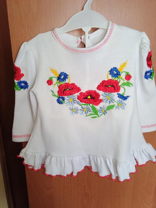Дуже гарна яскрава вишиваночка для маленької україночки. Стан дуже добрий, є ледь помітні жовті плямки ( показала на останньому фото). На вік приблизно з 3-4 і до 7 місяців. Заміри при необхідності надам.