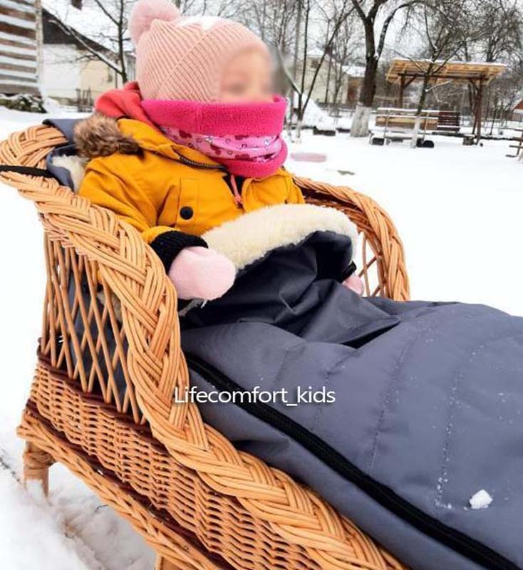 Комплект - чехол + рукавички. Очень теплый, практичный чехол на овчине на зиму! Плотная, непродуваемая и непромокаемая колясочная ткань (не плащевка), очень высокое качество. Для колясок, люлек, прогулок и санок. Для маминых и папиных ручек - рукавицы из такого же материала, которые надеваются на ручку коляски. Состав: 70/30 % - Натуральная овчинка/искусственный мех. Уникальные свойства овчины позволяют использовать конверт и в осенние дождливые дни, поскольку он не отсыревает, и в морозные зимы, так как внутри хорошо сохраняется тепло, и при капризной весенней погоде, поскольку он поддерживает постоянную температуру, защищая и от переохлаждения, и от перегрева. Мы работаем с этой продукцией 6 лет. Производство Харьков - Украина. Не уступают по качеству дорогим импортным конвертам. Размер конверта 98*48 см. Для детей от рождения до 3 лет Верхняя часть чехла полностью отстёгивается, по бокам расположены 2 удобные молнии; Сверху можно затянуть шнурками и оформить капюшон; Есть прошитые места для прорезей под ремни безопасности; Подходит в любую люльку или прогулочную коляску; Подойдет для санок, задний клапан удобно крепится к спинке; Есть светоотражающая полоса для безопасности ребенка во время катания в темное время суток, Внутри конверта нашита плотная плащевая ткань, чтоб не запачкать овчину грязными ножками. Муфты также можно приобрести отдельно. ❤️Хороших покупок❤️ Спасибо за выбор и доверие)