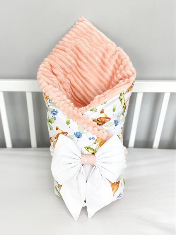 Одеяло-конверт со съемным утеплителем (внутри утеплитель в чехле), с обратной стороны нежный плюш. Тканина бавовна. Размер пледа 100х80 Бантик на резинке, чтобы использовать как конверт на выписку в комплекте.