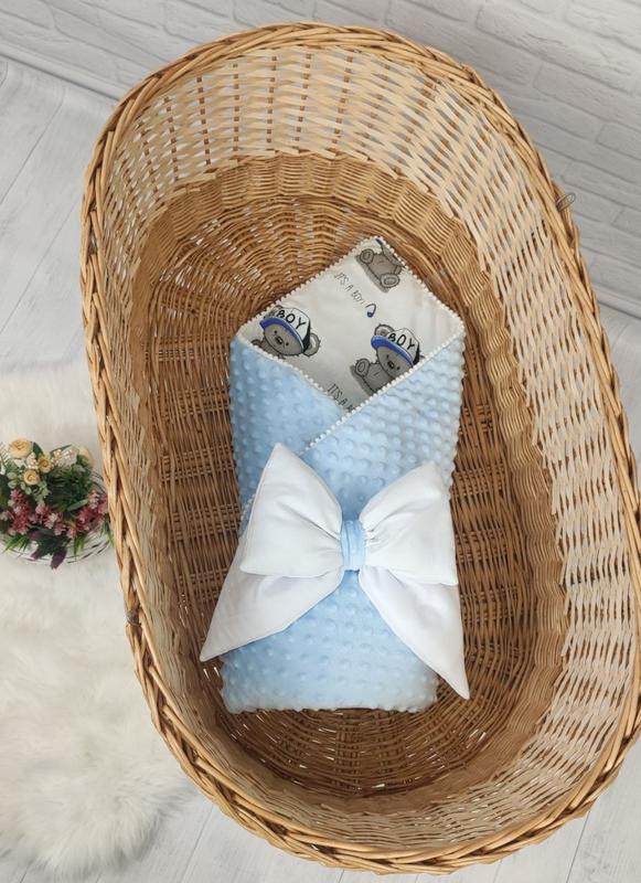 Самые популярные плюшевые конверты на выписку для новорожденных. Премиум Класса! Двусторонний - можно использовать по желанию любую со сторон. Размер - 80см * 80 см Идеальный размер, подходит для использования в дальнейшем в кроватку или коляску. Ткани-сочетание плюша с польским хлопком-беспроигрышный вариант. Плед-конвертик- на молнии; Наполнитель съемный; Фиксируется бант-резинкой