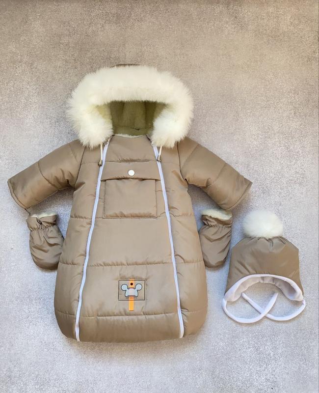 Конверт-комбинезон с шапочкой 0-6 мес. Ткань плащевая (водо, ветронепроницаемая). Внутри мягкая, теплая набивная овчина. Опушка на капюшоне и бубон съемные, искусственный кролик зима.