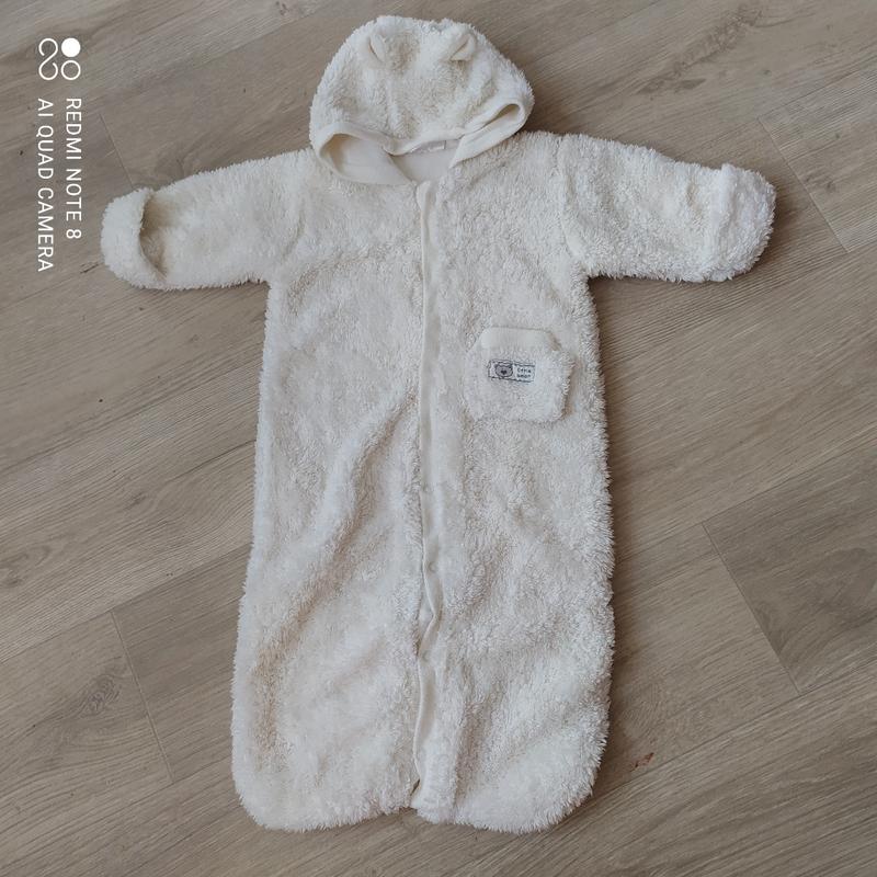 Слип кокон мишутка, молочного цвета, внутри на флисе, очень мягкий. Застежка: сверху молния снизу кнопки., для удобства. Производитель OKAY. На 2-5 месяцев. Длина от капюшона 64 Перчатки от пройма 22