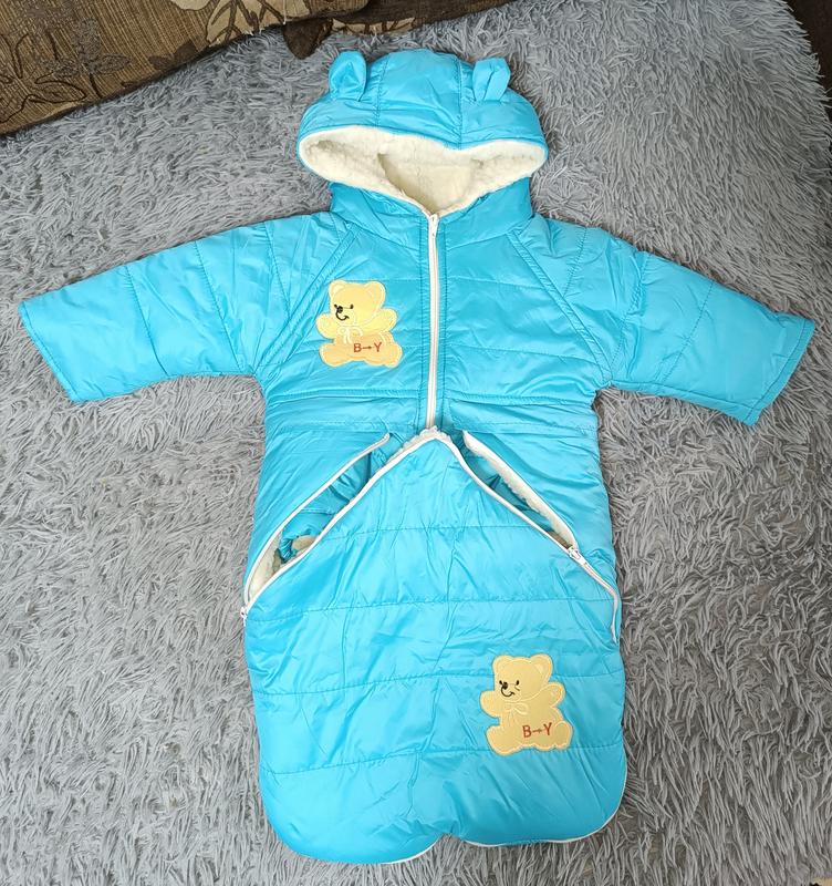 Тепловой зимний конверт, который трансформируется в комбинезон, внутри овчина.В наборе синие брюки из такой же ткани и перчатки.Одежды пара раз, темное состояние нового, эффектов,пятна!Внутри мех белый.Размер от рождения и подойдет целых 1,5-2 лет.
