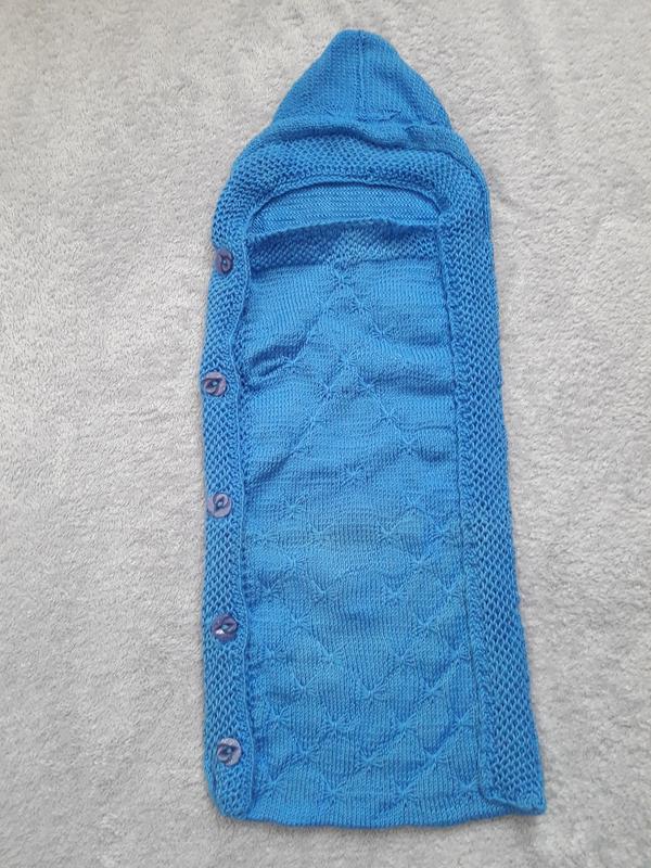 Прекрасный вязанный конверт на пуговицах для новорожденного. Подойдет для мальчика от 0 до 3 месяцев. Ручная вязка. Конверт очень красивый и оригинальный. Удобен и практичен в использовании.