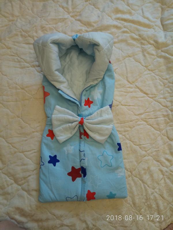 Конверт пошит на выписку под заказ из высококачественных натуральных тканей. В идеальном состоянии. Бантик_поясок застегивается на липучке. При помощи скрытых молний конверт трансформируется в одеяло. Очень яркий и красивый в идеальном состоянии.