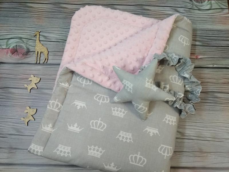 Тепленький плед из нежного плюша и хлопка, утеплён синтепоном. Размер 77 *95. Также в комплекте звездочка - резинка. Плед может быть одеялком в кроватку, в коляску, а можно сложить как конверт на выписку. Ткань гипоаллергенна, а значит не вызывает раздражения, аллергию и прочие неприятные ощущения при контакте с кожей малыша. Пелёнка хлопковая 80*100.