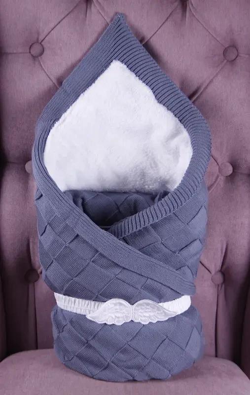 Теплый конверт одеяло для новорожденных. Выполнен из вязаного полотна 100% хлопковая нить, утеплен силиконизированным синтепоном 100 мг/м2, подкладка выполнена из нежной махры велсофт. Фиксирующая резинка с милыми крылышками в комплекте. Размер конверта: 95*95 см