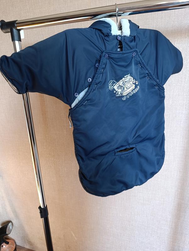 Комбинезон-конверт для новорожденного, на осенню погоду. Планка конверта на молнии и на пуговицах. Есть специальнные отверстия для проверки температуры малыша. Цвет - темно-синий. Капюшон не отстегивается ДИ - 55см ширина (от проймы до проймы) - 37см длина рукава (по внутреннему шву) - 14см