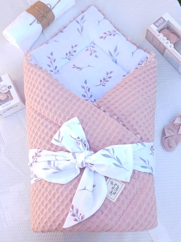 👶Конверт-пленка для девочек выполнен в нежном пудрово-розовом цвете из вафельной ткани, которая приятна на ощупь и хорошо пропускает воздух. Внутри – мягкая подкладка из белой муслиновой ткани с изящным цветочным принтом в нежно-розовых и серых оттенках. Конверт отделан аккуратными помпонами по краю и перевязан белой лентой с таким же цветочным рисунком, что придает ему изысканности и праздничного вида. Данный конверт станет идеальным выбором для выписки из роддома, фотосессий или ежедневных прогулок, обеспечивая малышу комфорт и тепло, а родителям – эстетическое удовольствие от стильного аксессуара. ⚜️Ткань Греческая вафля 100% cotton Производитель: Турция ⚜️Ткань Муслин 2-х слойный 100%cotton Производитель: Турция ⚜️Наполнение 200г гиппоаллергенный синтепон. ⚜️Отделка: помпоны, завязка-бант.