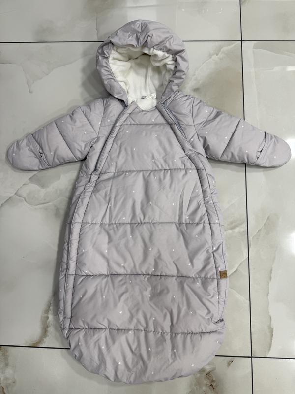 Классный конверт внутри на флисе качество супер, очень теплый. Состояние идеальное, родила в конце зимы малыша выгуливали в нем несколько раз. Размер указан 62/68, но можно с рождения использовать.