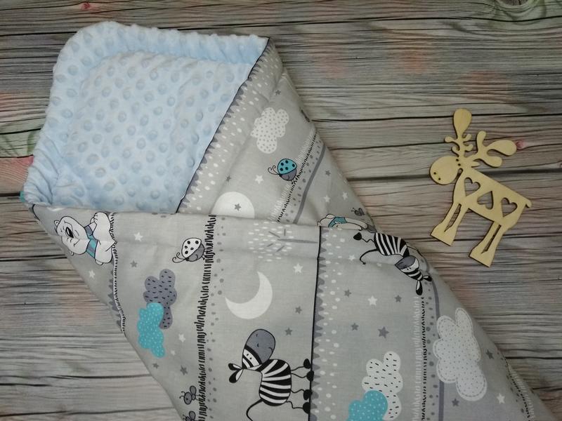 Тепленький плед из нежного плюша и хлопка, утеплен синтепоном. Размер 95*77 см. Можно использовать как одеяло в кроватку, в коляску, а можно сложить как конверт на выписку. Гипоаллергенная ткань, а значит не вызывает раздражения, аллергию и другие неприятные ощущения при контакте с кожей малыша.