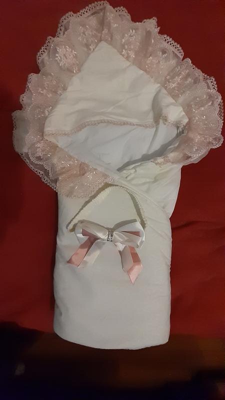 Роскошный конверт на выписку для новорожденной девочки. Снаружи конверт-одеяло выполнен из бязи (100% хлопок), внутри - махра 100% хлопок, утеплитель - синтепон. Фиксируется конверт с помощью банта Есть капюшон, чтобы малышу было максимально тепло и комфортно. Украшено изделие нежным, утонченным кружевом. Размер конверта 95х95 см Состояние нового