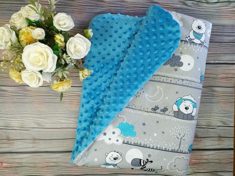 Тепленький плед из нежного плюша и хлопка, утеплён синтепоном. Размер 95*77 см. Может быть одеялком в кроватку, в коляску, а можно сложить как конверт на выписку. Ткань гипоаллергенна, а значит не вызывает раздражения, аллергию и прочие неприятные ощущения при контакте с кожей малыша. Пелёнка хлопковая 80*100. В наличии гораздо больше расцветок. К пледу можно заказать пелёночки, простынь в кроватку или коляску, подушечку и т. д.