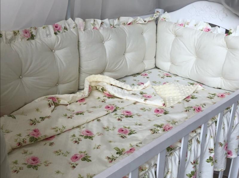 Большие бортики, на три стороны, со стразами, также есть в наличии простынка на резинке плед, бант, подушечка бабочка