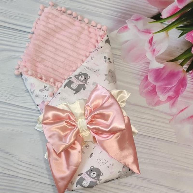Конверт-плед на выписку двусторонний Фиксируется бантиком на резинке Съемный синтепон Материал: плюш - шиншилла+бязь Можно использовать как одеяльце в детскую кроватку и в коляску Весна-Лето-Осень