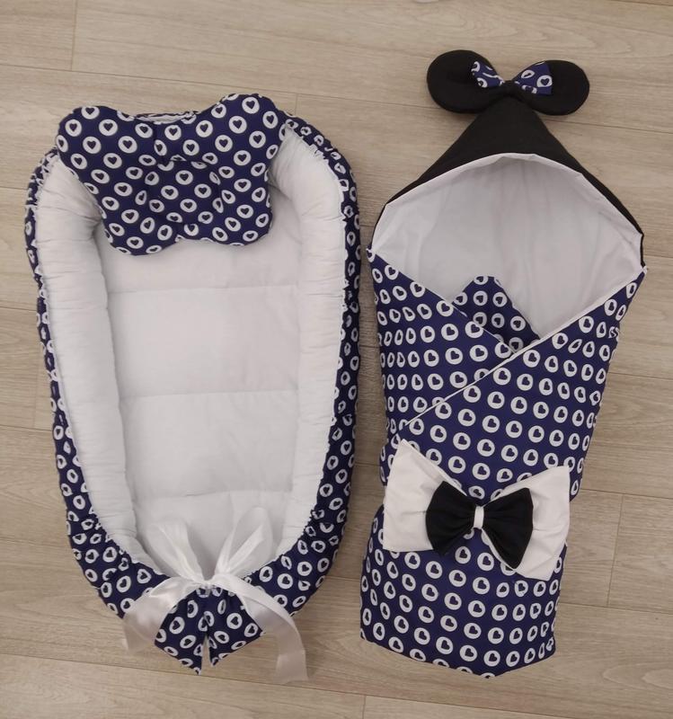 Комплект Конверт и Кокон гнездышко Ушки сердечки в круге на синем+ подушечка, весна-осень или лето( зима +20 грн.) Комплект на выписку, сослужит вашему малышу, долгую, теплую и уютную службу. Натуральные материалы от польского производителя, гипоаллергенный наполнитель, модные и трендовые ткани! Конверт на выписку, послужит не только прекрасным подарком к рождению и выписки из роддома, он защитит вашего малыша от холода, во время прогулок на свежем воздухе, а так же нежно укроет ребенка, превратившись дома в обычное одеялко. Кокон гнездышко (позиционер), позволит ребенку чувствовать себя более защищенным. Благодаря правильной форме кокона, ребенок будет находится в правильной позе. Кроме того, кокон очень удобно использовать в гостях, ваш малыш, будет в нем себя чувствовать "как дома". Материалы: Верх - 100% хлопок производство Польша. Наполнитель - гиппоалергенный синтепон, холлофайбер. Размер конверта в развернутом виде - 90х90 см. Размер кокон гнезда - 80х48 см. Высота бортиков кокон гнезда - 10 см. Комплектация: Конверт-одеялко весна-осень или лето( зима +20 грн.) и кокон-гнёздышко + подушечка. Так же есть возможность приобрести по отдельности Так же отшиваем бортики и постельку в едином стиле с любым из комплектов в наличие. Доставка: По Новой почтой, Укр почтой, всей территории Украины, наложенным платежом по минимальной предоплате. Пожалуйста перед заказом уточняйте наличие. С уважением, любовью и заботой о ваших малышах GleMa Miko 🤗