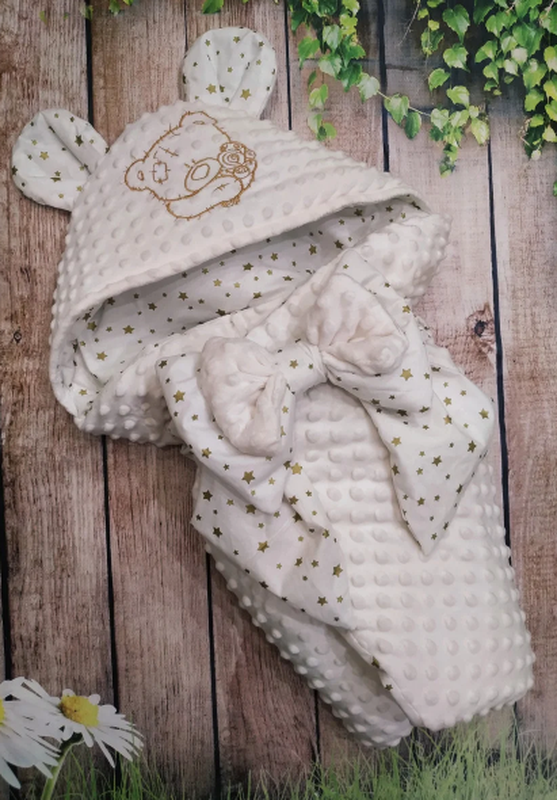 Конверт Тедді виконаний з бавовняного велюру з плюшевим покдладом На капюшоні вишивка Наповнювач демі - синтепон щільністю 200 г/м2 товщиною 2 см Наповнювач зима - синтепон щільністю 400 г/м2 товщиною 4 см Літній варіант без наповнювача Квітів багато, уточнюйте на момент покупки