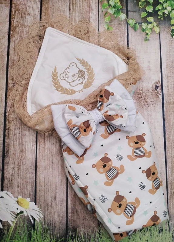 Конверт - ковдру на виписку бавовняний,, різні кольори (уточнюйте перед замовленням, більше 30 кольорів!) Розмір готового виробу 78*78 см, бант на резинці. Машинна вишивка шовковою ниткою Матеріал основи і підкладали - бавовна, польська, бязь, Наповнювач демі - синтепон щільністю 200 г/м2 товщиною 2 см Наповнювач зима - синтепон щільністю 400 г/м2 товщиною 4 см Наповнювач літо - синтепон щільністю 80 г/м2 товщиною 0,8 см або без наповнювача Трансформується в плед, зручно використовувати в колясці на прогулянках