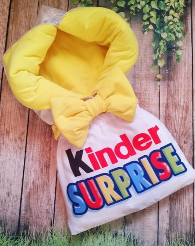 Кіндер Сюрприз 🙂 Конверт-плед (трансформер) на виписку зі знімною панеллю Конверт Кіндер трансформується в плед розміром 80*90 см, блискавки по всьому периметру Панелька з принтом знімна, на гумці , бант- на гумці Матеріали демі: сатин+демі синтепон+фліс Матеріали зима: махра+зима синтепон+фліс Ціна: 850грн.