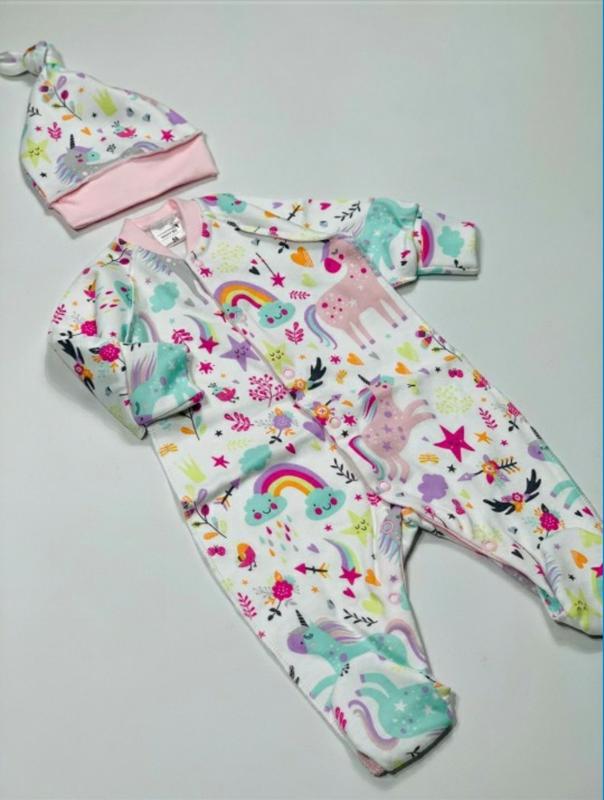 Комплект з 2 предметів. Чоловічок та шапочка. Чоловічок білий в кольоровий принт. Шви наружні. Матеріал бавовна. якість супер.