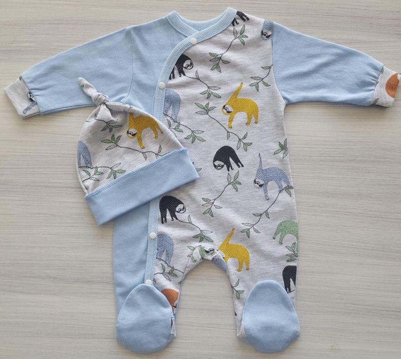 Комплект состоит из человечка и шапочки без завязок с узелком. Ткань кулир. Размеры 56 и 62. Цвет голубой.