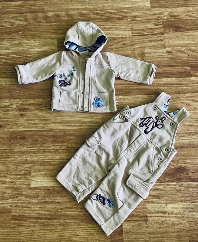 Прекрасный трикотажный костюмчик для мальчика. В комплект входить полукомбинезон на пномочках с регулируемыми бретелями и курточка с капюшоном на подкладке. На костюме есть декорация - объёмная аппликация зверушек. Отличное качество . Состав 100 % хлопок Размер 3-6 месяцев ( будет на дольше)