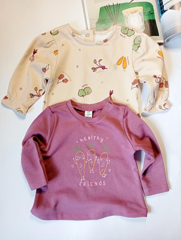дуже гарний фасон, незвичний принт. світліший з рукавами "фонаріками", низ з рюшкою на резинці. темніший чуть розширений донизу. хороша якість, принт не боїться прання та прасування. тканина бавовна, тринитка, плотні, не тоненькі. ціна за один.