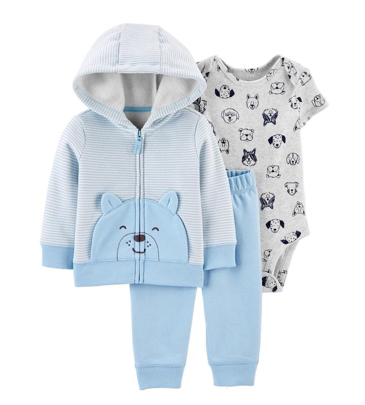 В наборе: утепленная кофточка, хлопковые штанишки, боди на короткий рукав. В наличии размеры 12м.