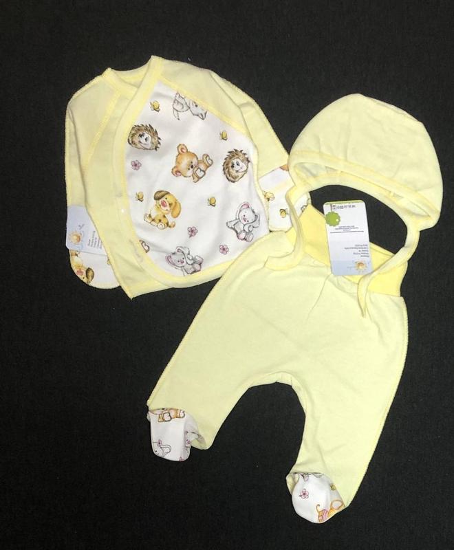 Комплект 3в1 складається із сорочечки (льолі), повзунків та шапочки.Чудово підійте в пологовий будинок із перших хвилин народження. Виготовлений із натуральної тканини - футер (бавовна з начосом). Шви назовні. Малюку в такому комлекті буде комфортно як в маминих обіймах. Підходить на зиму або холодний демісезон.