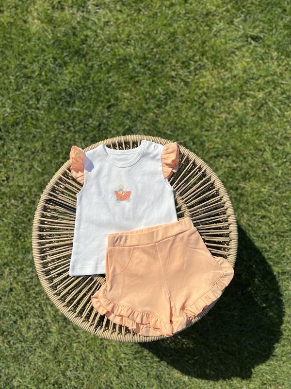 Комплект из футболочки и шортиков с оборочками. Яркая мягкая ткань, натуральный состав 100% бавовна Размеры от 1 месяца до 2 лет