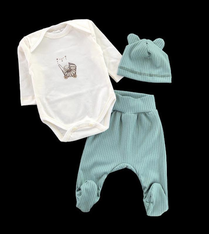 Комплект 3в1 складається із боді, повзунків та шапочки.Чудово підійте в пологовий будинок із перших хвилин народження.Комплект виготовлений із натуральної тканини: повзунки/штанці та шапочка - мустанг (трикотаж рубчик), боді - інтерлок.Малюку в такому комлекті буде комфортно як в маминих обіймах.