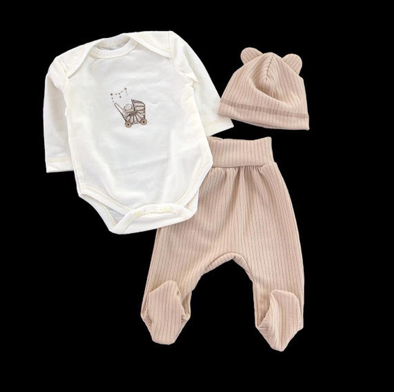 Комплект 3в1 складається із боді, повзунків та шапочки.Чудово підійте в пологовий будинок із перших хвилин народження.Комплект виготовлений із натуральної тканини: повзунки/штанці та шапочка - мустанг (трикотаж рубчик), боді - інтерлок.Малюку в такому комлекті буде комфортно як в маминих обіймах.