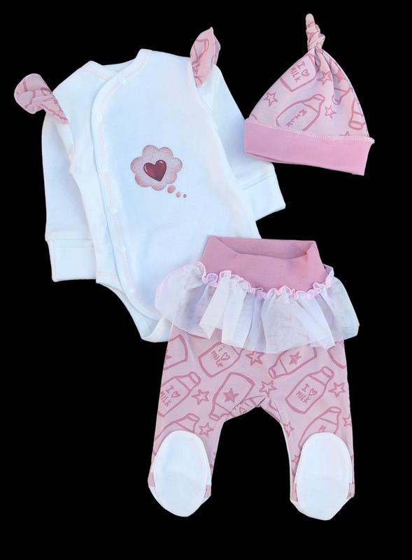 Комплект 3в1 складається із боді, повзунків та шапочки.Чудово підійте в пологовий будинок із перших хвилин народження.Виготовлений із натуральної тканини - інтерлок. Шви назовні.Малюку в такому комлекті буде комфортно як в маминих обіймах.