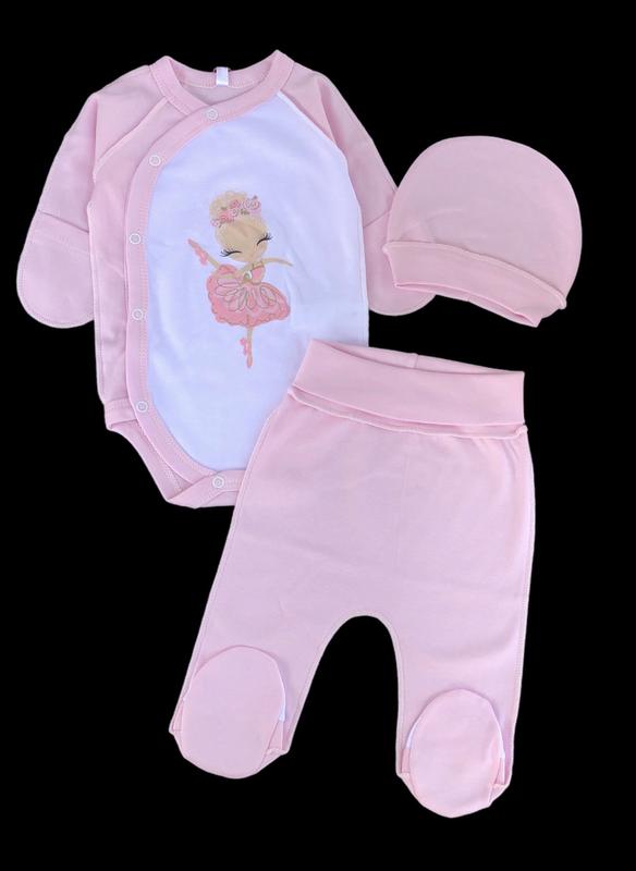 Комплект 3в1 складається із боді, повзунків та шапочки. Чудово підійте в пологовий будинок із перших хвилин народження.Виготовлений із натуральної тканини - бавовна.Шви назовні. Малюку в такому комлекті буде комфортно як в маминих обіймах.