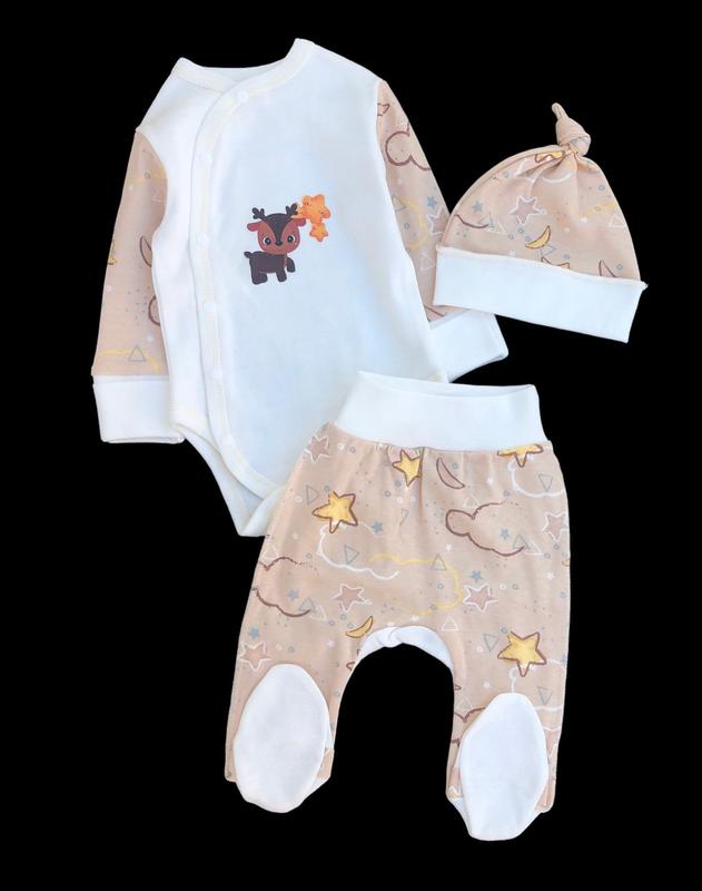 Комплект 3в1 складається із боді, повзунків та шапочки.Чудово підійте в пологовий будинок із перших хвилин народження.Виготовлений із натуральної тканини - інтерлок. Шви назовні.Малюку в такому комлекті буде комфортно? як в маминих обіймах.