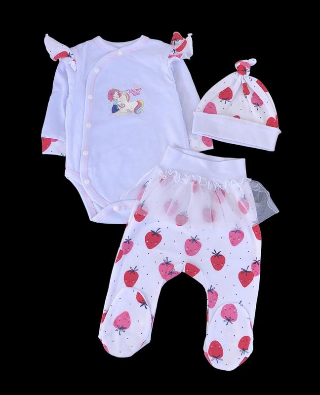Комплект 3в1 складається із боді, повзунків та шапочки.Чудово підійте в пологовий будинок із перших хвилин народження.Виготовлений із натуральної тканини - інтерлок.Малюку в такому комлекті буде комфортно як в маминих обіймах.