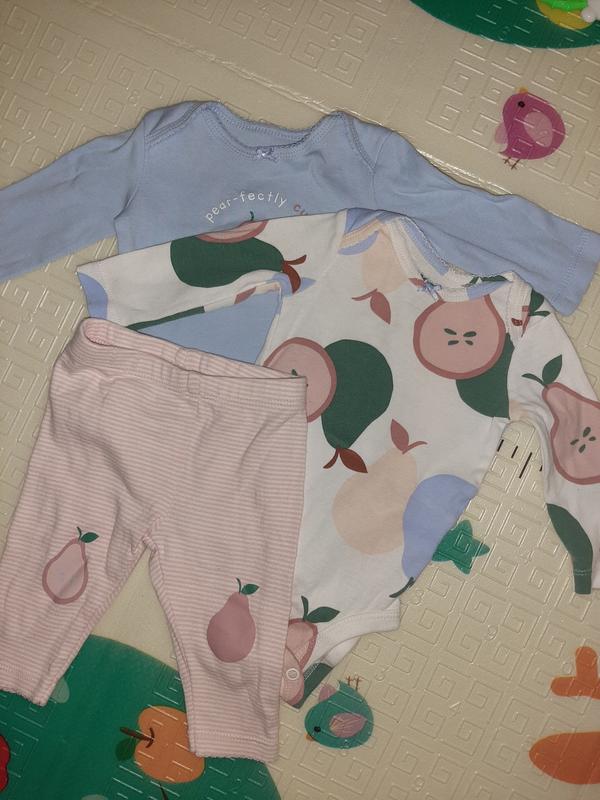 Набор Carter's лосины и два боди с длинным рукавом,ткань очень красивая. Подойдет от 1 до 4 мес. Шапочка состояния новой в подарок.