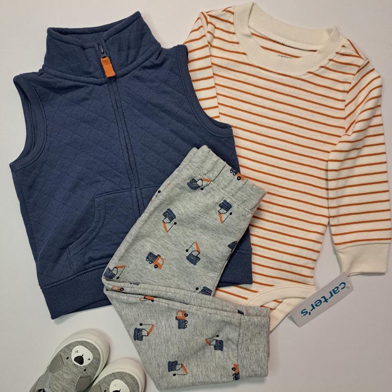 Стильный весенний комплект-тройка для мальчика от Сarter's. -Стеоганный желет на молнии с двумя действующими карманами; -Боды с длинным рукавчиком; -Джогеры с эластичным поясом на манжетах.