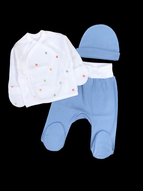 Комплект складається із сорочечки (льолі), повзунків та шапочки. Виготовлений із натуральної тканини - інтерлок (100% бавовна). Інтерлок - ніжне полотно, яке добре пропускає повітря і відмінно вбирає вологу. На рукавах сорочечки манжети-антицарапки, застібка - зручна кнопочка, щоб швидко переодягнути малюка. Пояс повзунів - широка трикотажна євро-резинка, що забезпечує дитині комфортне носіння та не давить на животик. Шви назовні. Комплект для новонароджених відмінно підійде, як одяг на кожен день, одяг для прогулянок, одяг на виписку або комплект одягу для малюка в подарунок на народження дитини.Трикотажний комплект для новонародженого чудово підійте в пологовий будинок із перших хвилин народження. Малюку в такому одязі буде комфортно, як в маминих обіймах. Розрахований на усі чотири сезони.