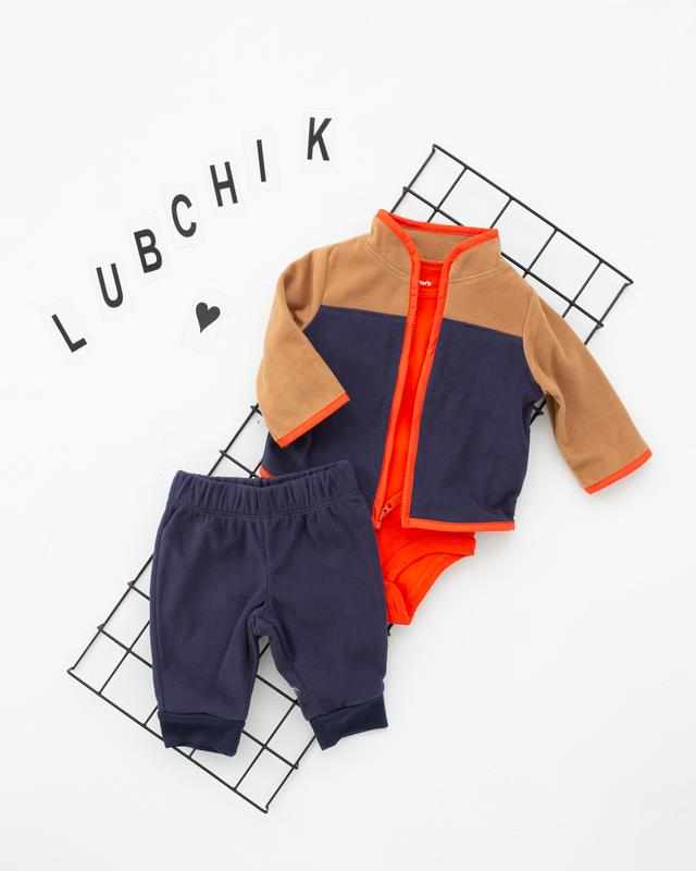 Микрофлисовый набор 3в1 для мальчика от Картерс Имеет микрофлисоу кофту коричнево-синюю на замочке по всей длине и синие микрофлисовые штанишки. Боди оранжевый на короткий рукав. Состав: штанишки и кофта 100% полиестер микрфлис, боди 100% хлопок.