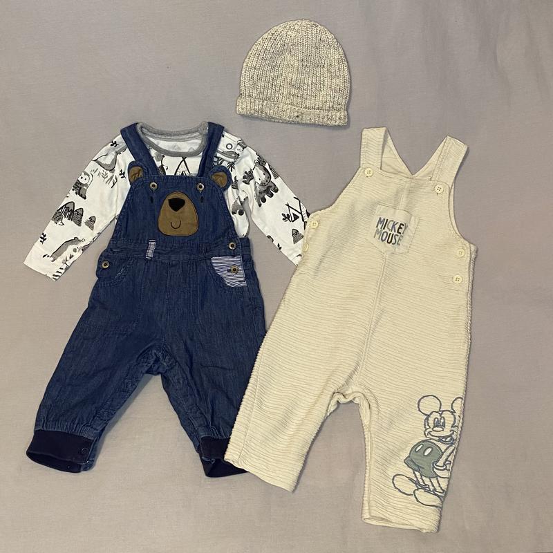 Набор / комплект 4 вещи: Комбез мешка 68 см/ лонгслив 62-68 см/ комбез Микки На размер 3-6 месяцев ориентировочно., бирки с размерами находятся на фото. Идеальное состояние вещей Цена за все вещи