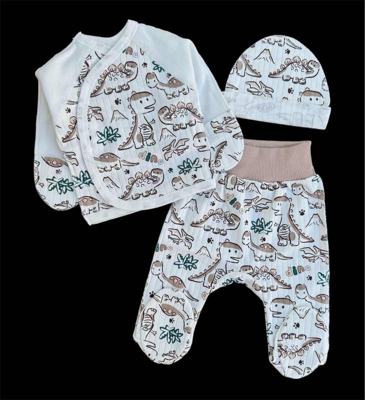 Комплект складається із сорочечки (льолі), повзунків та шапочки. Виготовлений із натуральної тканини - інтерлок (натуральна бавовна). Інтерлок - ніжне трикотажне полотно, яке добре пропускає повітря і відмінно вбирає вологу. На рукавах сорочечки манжети-антицарапки, застібка - зручна кнопочка, щоб швидко переодягнути малюка. Пояс повзунів - широка трикотажна євро-резинка, що забезпечує дитині комфортне носіння та не давить на животик. Шви назовні. Комплект для новонароджених відмінно підійде, як одяг на кожен день, одяг для прогулянок, одяг на виписку або комплект одягу для малюка в подарунок на народження дитини.Трикотажний комплект для новонародженого чудово підійте в пологовий будинок із перших хвилин народження. Малюку в такому одязі буде комфортно, як в маминих обіймах.