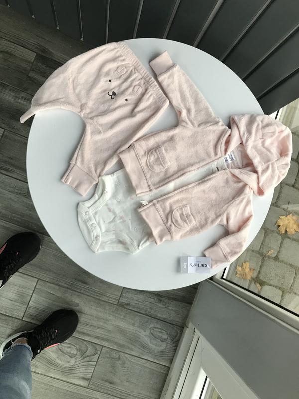 Ніжний комплект-трійка для дівчинки від Carter’s. Складається з худі, штанців і боді на короткий рукавчик. Махровий худі із застібкою замком і капюшоном з вушками. Штанці махрові з м’яким поясом -гумкою,ззаду прикрашені милою мордочкою ведмедика. Трикотажне боді із застібкою-кнопками між ніжок. СКЛАД: ХУДІ І ШТАНЦІ 86% БАВОВНА, 14% ПОЛІЕСТЕР; БОДІ 100% БАВОВНА. ———————————————————————- . 👇В наявності розмір👇 . ✅✅3 міс ✅✅(ріст 55-61 см, вага 4,1-5,7кг) . ✅✅6 міс✅✅(ріст 61-67 см, вага 5,7-7,7кг) . ❌❌9 міс❌❌ріст 67-72 см, вага7,7-9,5кг) . ❌❌12 міс ❌❌(ріст 72-78 см, вага 9,5-11,3кг)