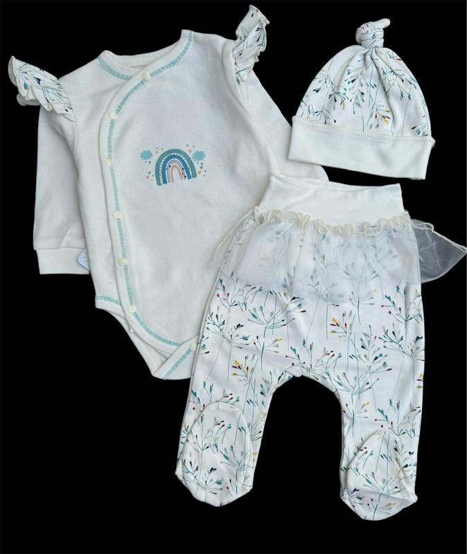 Комплект 3в1 складається із боді, повзунків та шапочки.Чудово підійте в пологовий будинок із перших хвилин народження.Виготовлений із натуральної тканини - інтерлок.Малюку в такому комлекті буде комфортно як в маминих обіймах.