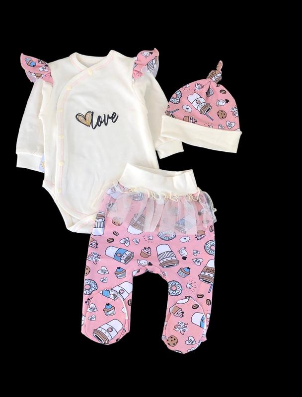Комплект 3в1 складається із боді, повзунків та шапочки.Чудово підійте в пологовий будинок із перших хвилин народження.Боді виготовлений із натуральної тканини - інтерлок, вовзунки із двунитки петля. Малюку в такому комлекті буде комфортно як в маминих обіймах.
