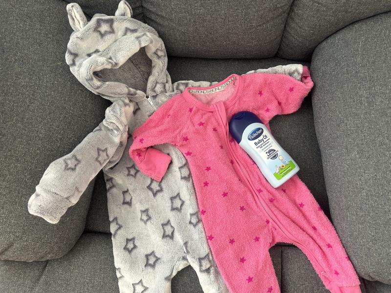 Комплект из комбинезона (стан нового) и ромпера для сна (махровый, очень теплый). Размер подходит 1-4 месяца. В подарок маселка для тела, не открывалась.